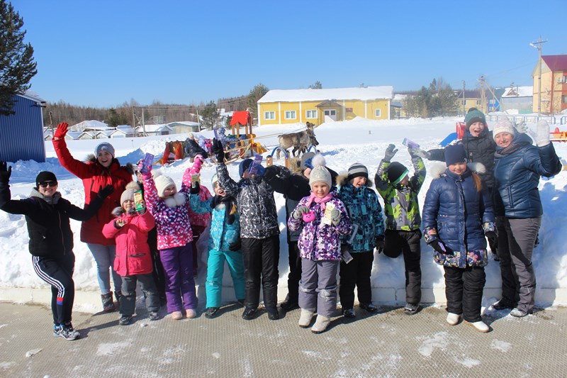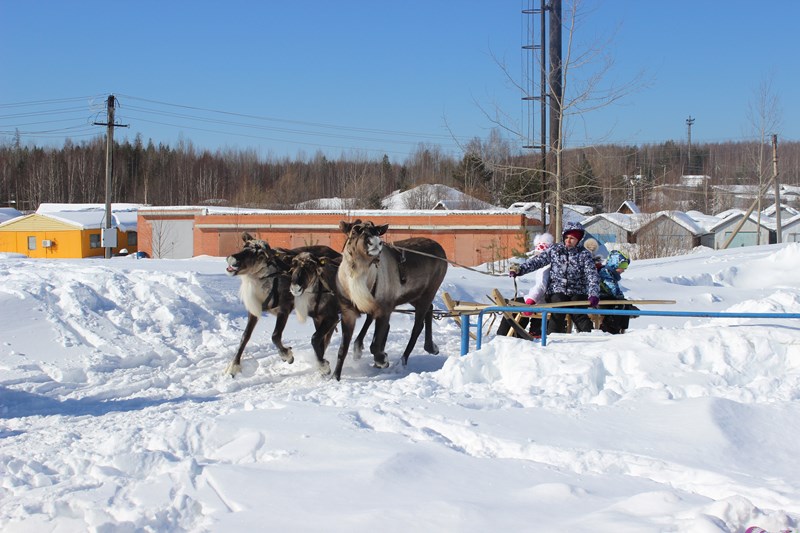 Мальчишки и девчонки посоревновались в эстафетах: «меткий стрелок», «лыжник», «на метле», а также померились силами в перетягивании каната! В заключение забав все ребята прокатались на настоящей оленей упряжке!